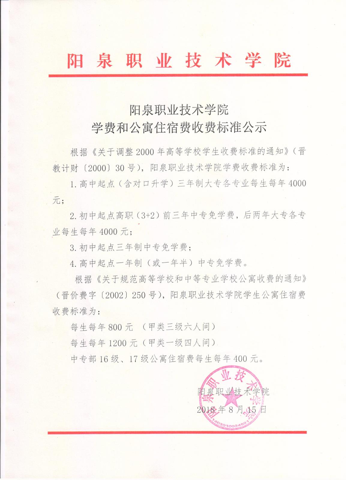 陽泉職業(yè)技術(shù)學院學費和公寓住宿費收費標準公示
